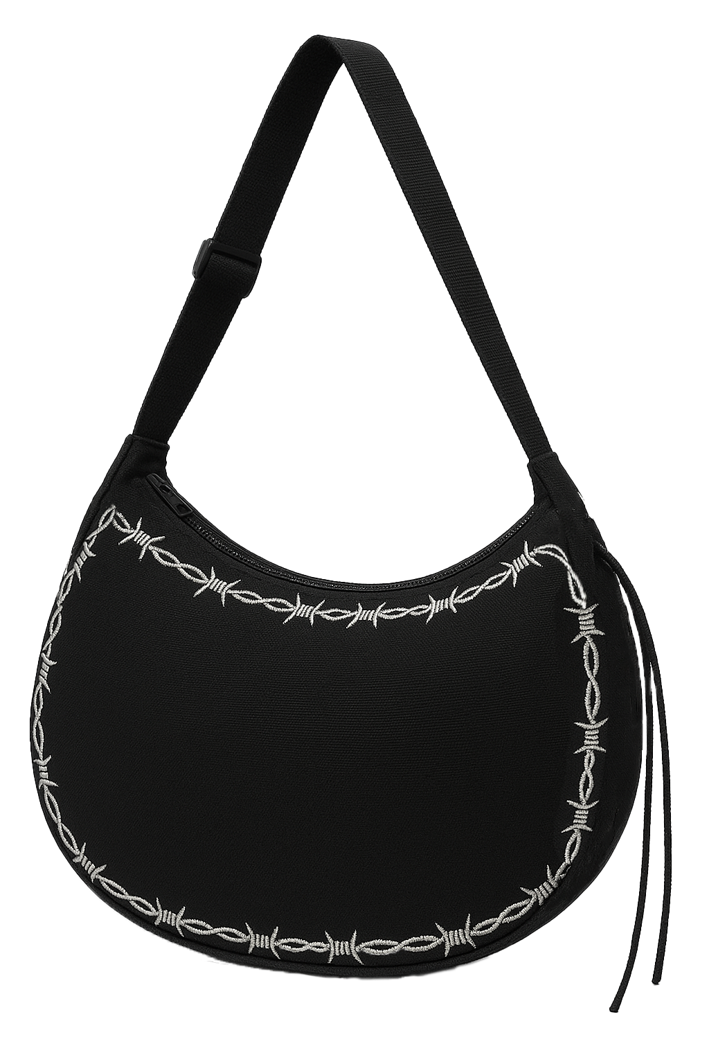 Unleash bold style with the GRINTX Barbed Stitch Shoulder Bag — a compact yet striking accessory crafted for those who don’t follow trends, they set them. Made from durable black canvas, this shoulder bag features intricate barbed wire embroidery along the front, back, and edges, giving it a raw, rebellious aesthetic.