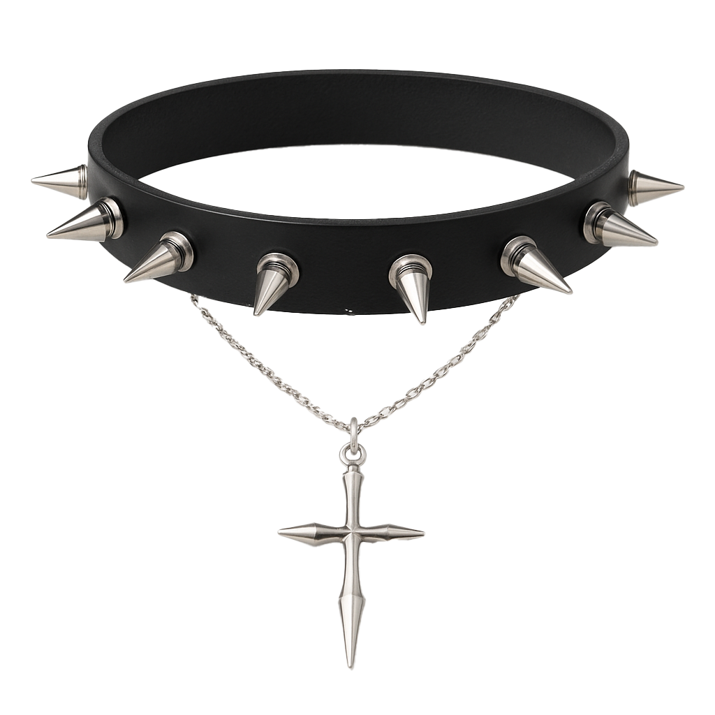 Unleash your dark edge with the GRINTX Spiked Choker, crafted from black faux leather and accented with aggressive metal spikes. A dangling silver-tone cross pendant on a fine chain completes the bold, gothic-punk look. Adjustable fit for comfort and impact.
