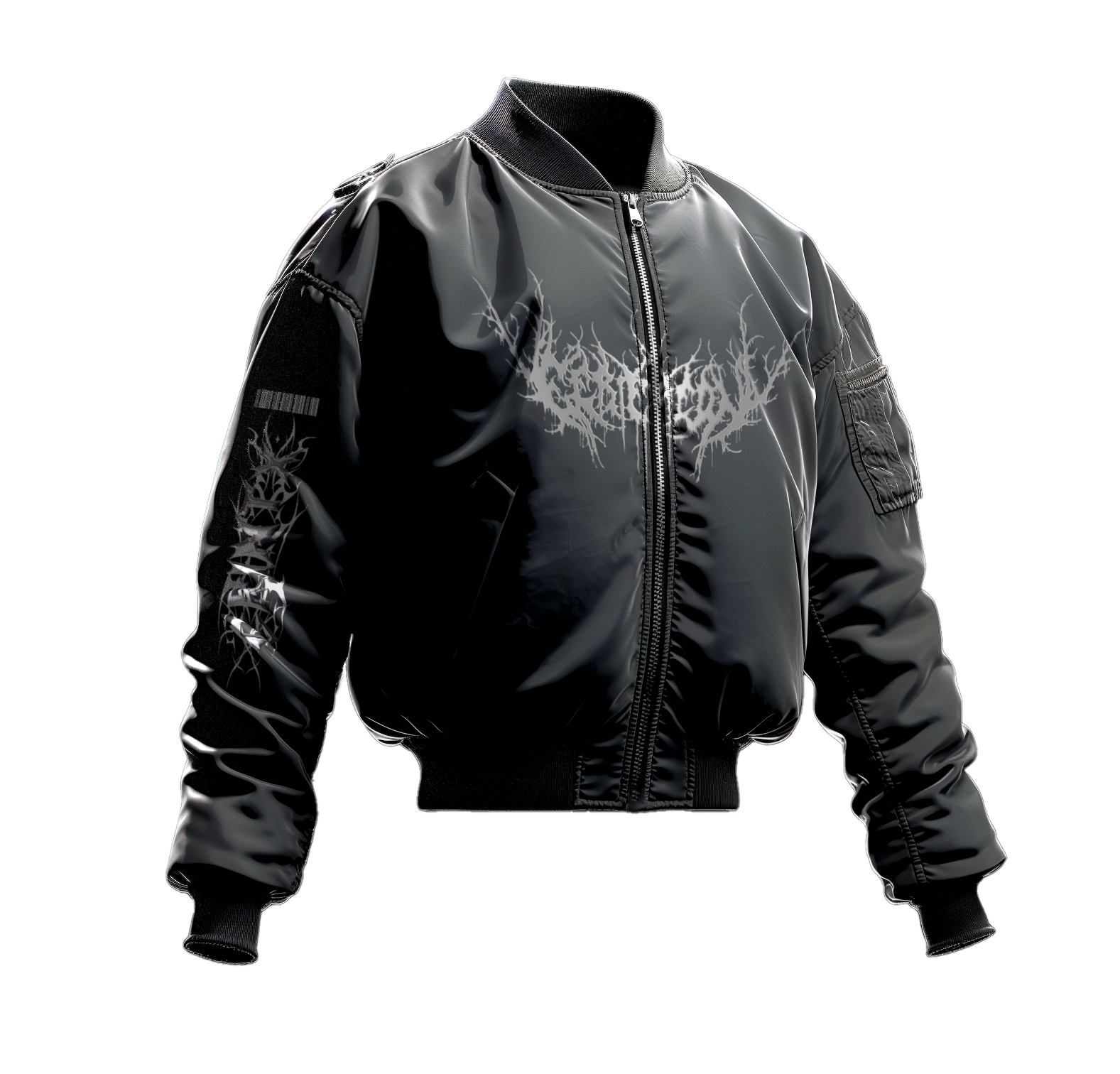 Make a style statement with the GRINTX bomber jacket, a staple of the dark streetwear wardrobe. Made from a shiny black fabric with a satin effect, this piece captures the light boldly, while retaining a clean, sharp look. The GRINTX logo, in silver-tone black metal lettering, sits proudly on the chest and sleeve, reinforcing its underground, rebellious aesthetic.